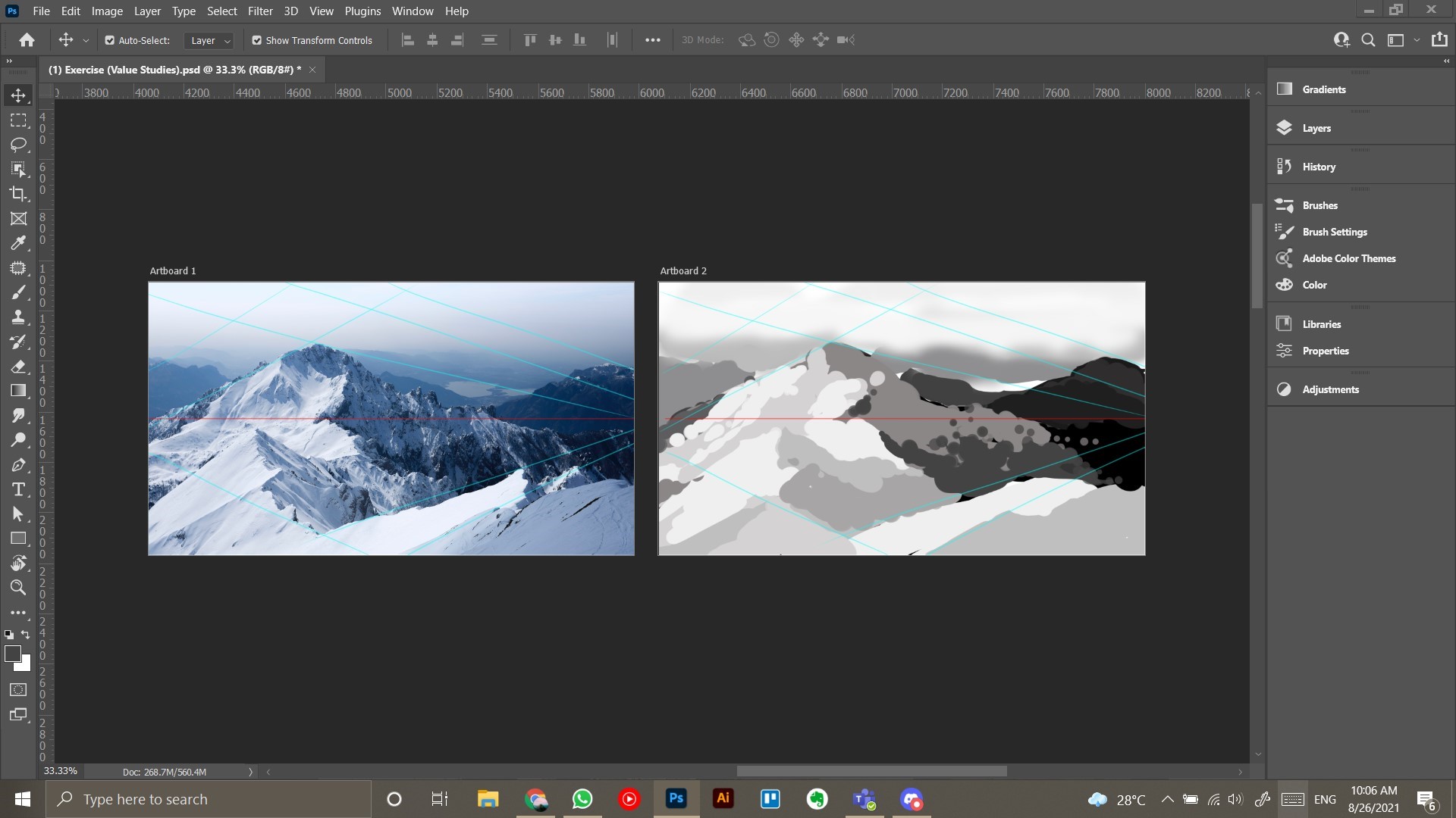 Below is my progression. To start with this exercise, I identify the horizon and the vanishing points.